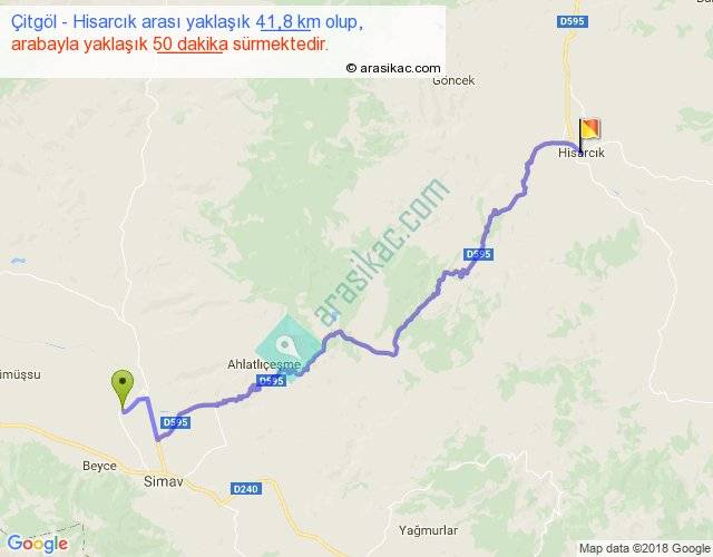 Çitgöl - Hisarcık arası yaklaşık olarak 90 km/h ile yukarıda belirtilen sürede olup, iki yerin kuş uçuşu uzaklığı (mesafesi) 28'dir. Yolculuk otobüsle 1 saat 5 dakika sürmektedir.