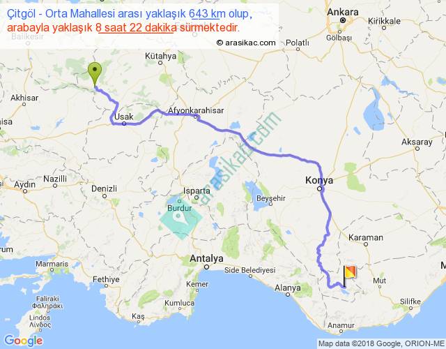 Çitgöl - Orta Mahallesi arası yaklaşık olarak 90 km/h ile yukarıda belirtilen sürede olup, iki yerin kuş uçuşu uzaklığı (mesafesi) 440'dir. Eğer belirtilen yerler arasında uçak seferi var ise bu süre uçakla 40 dakika'ya kadar düşebilir. Yolculuk otobüsle 10 saat 52 dakika sürmektedir.