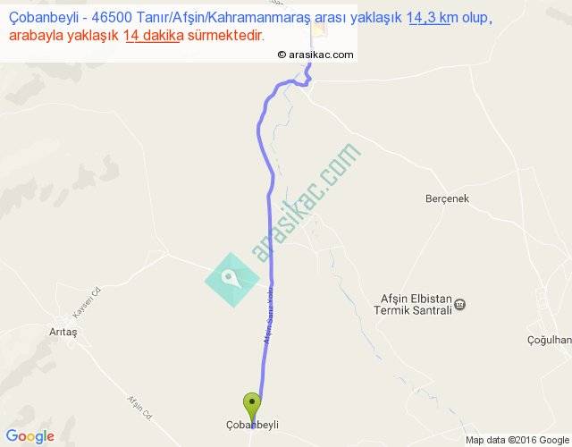 Çobanbeyli - 46500 Tanır Afşin Kahramanmaraş arası yaklaşık olarak 90 km/h ile yukarıda belirtilen sürede olup, iki yerin kuş uçuşu uzaklığı (mesafesi) 13'dir. Yolculuk otobüsle 18 dakika sürmektedir.