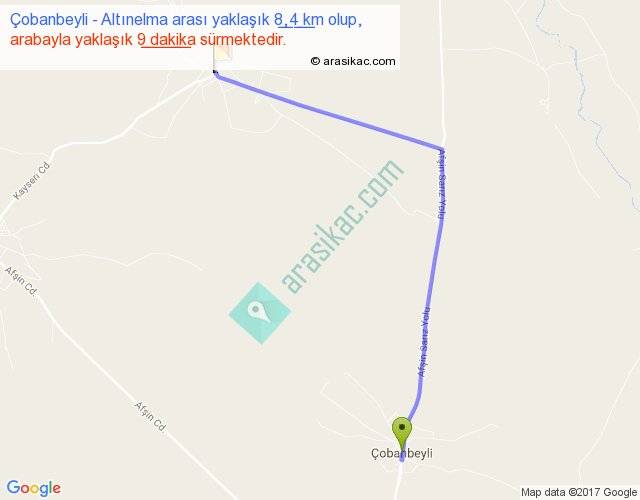 Çobanbeyli - Altınelma arası yaklaşık olarak 90 km/h ile yukarıda belirtilen sürede olup, iki yerin kuş uçuşu uzaklığı (mesafesi) 6'dir. Yolculuk otobüsle 11 dakika sürmektedir.