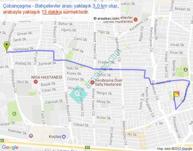 Çobançeşme - Bahçelievler arası yaklaşık olarak 90 km/h ile yukarıda belirtilen sürede olup, iki yerin kuş uçuşu uzaklığı (mesafesi) 2'dir. Yolculuk otobüsle 16 dakika sürmektedir.