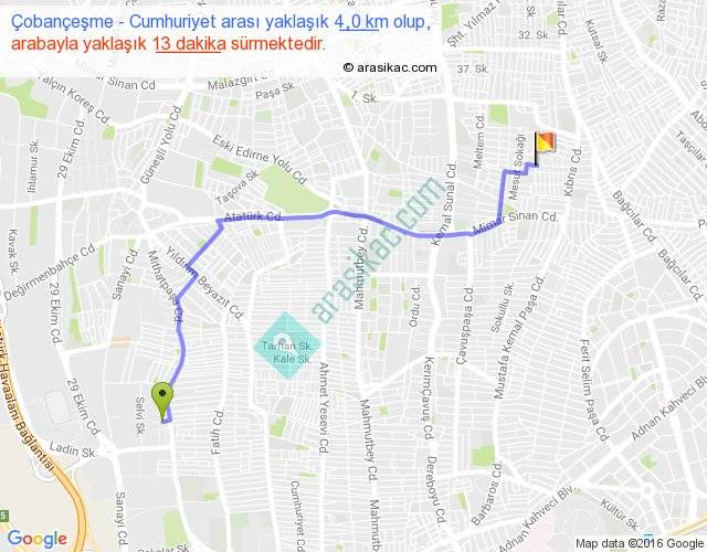 Çobançeşme - Cumhuriyet arası yaklaşık olarak 90 km/h ile yukarıda belirtilen sürede olup, iki yerin kuş uçuşu uzaklığı (mesafesi) 3'dir. Yolculuk otobüsle 16 dakika sürmektedir.