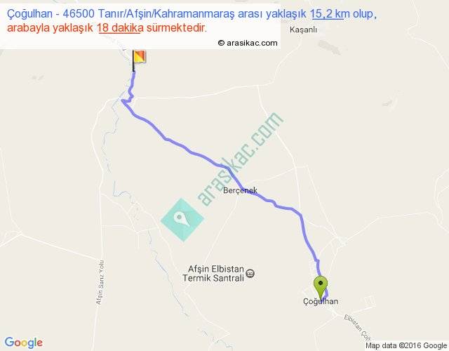 Çoğulhan - 46500 Tanır Afşin Kahramanmaraş arası yaklaşık olarak 90 km/h ile yukarıda belirtilen sürede olup, iki yerin kuş uçuşu uzaklığı (mesafesi) 13'dir. Yolculuk otobüsle 23 dakika sürmektedir.
