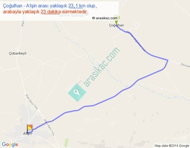 Çoğulhan - Afşin arası yaklaşık olarak 90 km/h ile yukarıda belirtilen sürede olup, iki yerin kuş uçuşu uzaklığı (mesafesi) 14'dir. Yolculuk otobüsle 29 dakika sürmektedir.