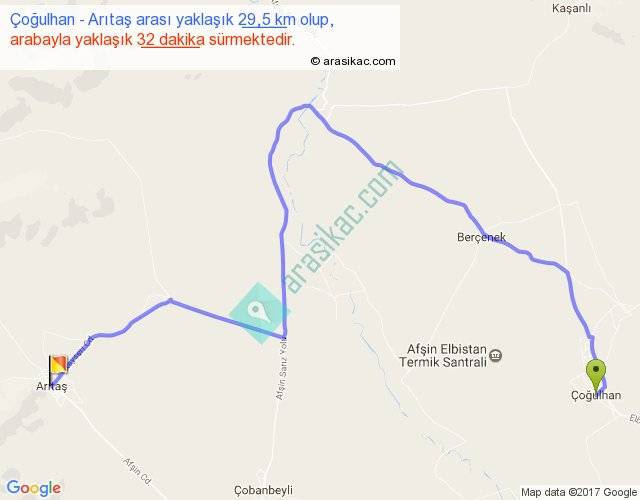 Çoğulhan - Arıtaş arası yaklaşık olarak 90 km/h ile yukarıda belirtilen sürede olup, iki yerin kuş uçuşu uzaklığı (mesafesi) 16'dir. Yolculuk otobüsle 41 dakika sürmektedir.
