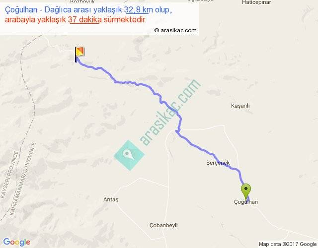 Çoğulhan - Dağlıca arası yaklaşık olarak 90 km/h ile yukarıda belirtilen sürede olup, iki yerin kuş uçuşu uzaklığı (mesafesi) 26'dir. Yolculuk otobüsle 48 dakika sürmektedir.