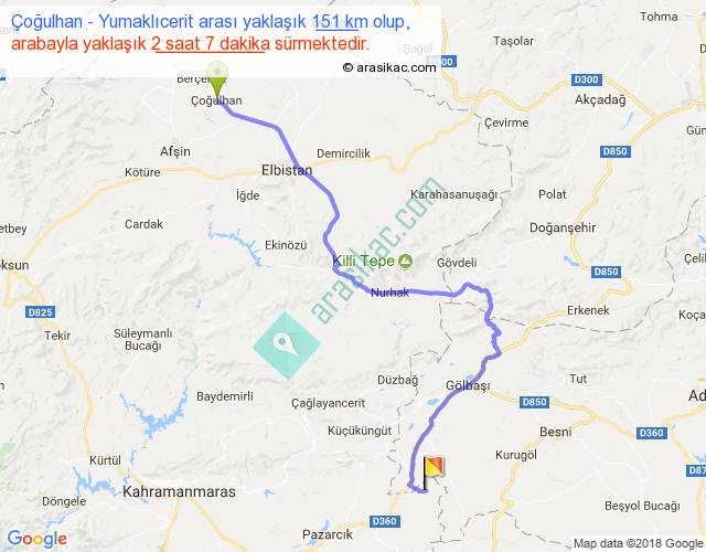 Çoğulhan - Yumaklıcerit arası yaklaşık olarak 90 km/h ile yukarıda belirtilen sürede olup, iki yerin kuş uçuşu uzaklığı (mesafesi) 96'dir. Yolculuk otobüsle 2 saat 45 dakika sürmektedir.