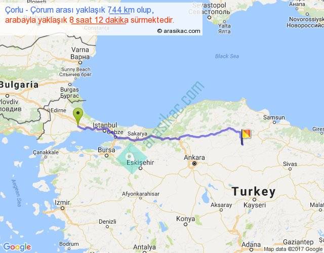 Çorlu - Çorum arası yaklaşık olarak 90 km/h ile yukarıda belirtilen sürede olup, iki yerin kuş uçuşu uzaklığı (mesafesi) 601'dir. Eğer belirtilen yerler arasında uçak seferi var ise bu süre uçakla 55 dakika'ya kadar düşebilir. Yolculuk otobüsle 10 saat 39 dakika sürmektedir.