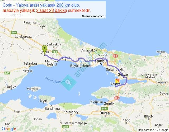 Çorlu - Yalova arası yaklaşık olarak 90 km/h ile yukarıda belirtilen sürede olup, iki yerin kuş uçuşu uzaklığı (mesafesi) 135'dir. Yolculuk otobüsle 3 saat 12 dakika sürmektedir.