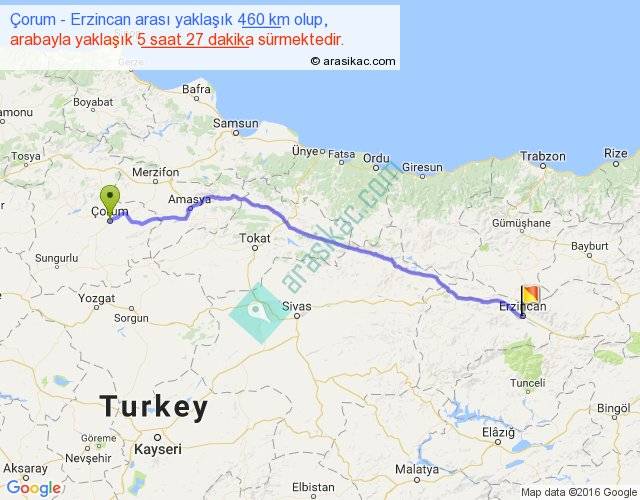 Çorum - Erzincan arası yaklaşık olarak 90 km/h ile yukarıda belirtilen sürede olup, iki yerin kuş uçuşu uzaklığı (mesafesi) 393'dir. Eğer belirtilen yerler arasında uçak seferi var ise bu süre uçakla 36 dakika'ya kadar düşebilir. Yolculuk otobüsle 7 saat 5 dakika sürmektedir.