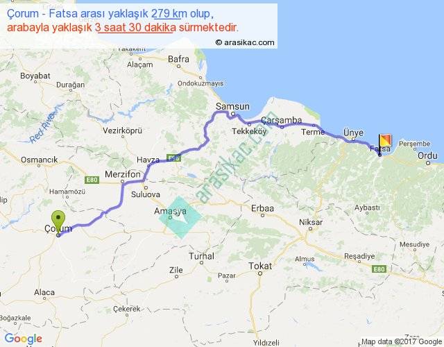 Çorum - Fatsa arası yaklaşık olarak 90 km/h ile yukarıda belirtilen sürede olup, iki yerin kuş uçuşu uzaklığı (mesafesi) 220'dir. Yolculuk otobüsle 4 saat 33 dakika sürmektedir.