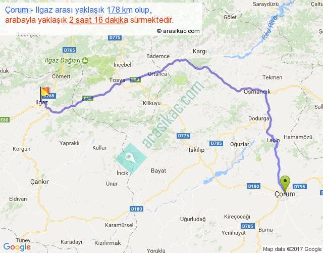 Çorum - Ilgaz arası yaklaşık olarak 90 km/h ile yukarıda belirtilen sürede olup, iki yerin kuş uçuşu uzaklığı (mesafesi) 119'dir. Yolculuk otobüsle 2 saat 56 dakika sürmektedir.