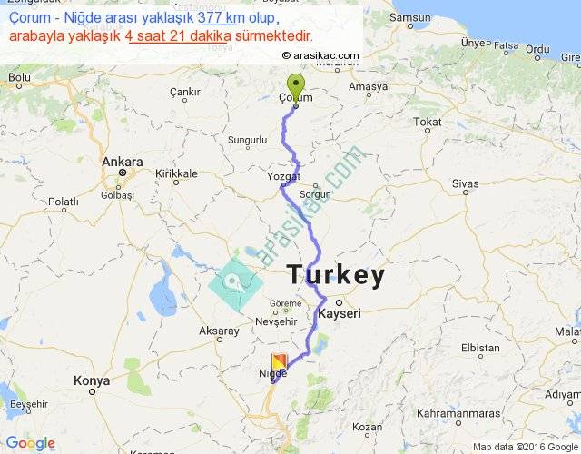Çorum - Niğde arası yaklaşık olarak 90 km/h ile yukarıda belirtilen sürede olup, iki yerin kuş uçuşu uzaklığı (mesafesi) 286'dir. Eğer belirtilen yerler arasında uçak seferi var ise bu süre uçakla 26 dakika'ya kadar düşebilir. Yolculuk otobüsle 5 saat 39 dakika sürmektedir.
