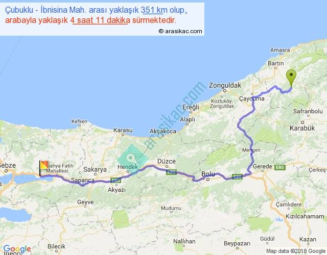 Çubuklu - İbnisina Mah. arası yaklaşık olarak 90 km/h ile yukarıda belirtilen sürede olup, iki yerin kuş uçuşu uzaklığı (mesafesi) 238'dir. Yolculuk otobüsle 5 saat 26 dakika sürmektedir.