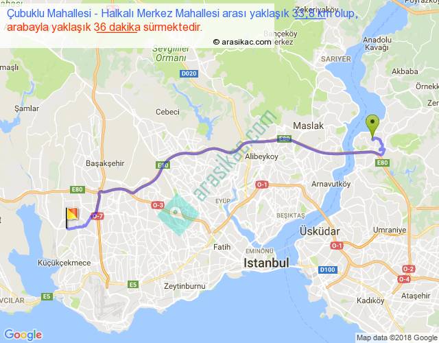 Çubuklu Mahallesi - Halkalı Merkez Mahallesi arası yaklaşık olarak 90 km/h ile yukarıda belirtilen sürede olup, iki yerin kuş uçuşu uzaklığı (mesafesi) 27'dir. Yolculuk otobüsle 46 dakika sürmektedir.