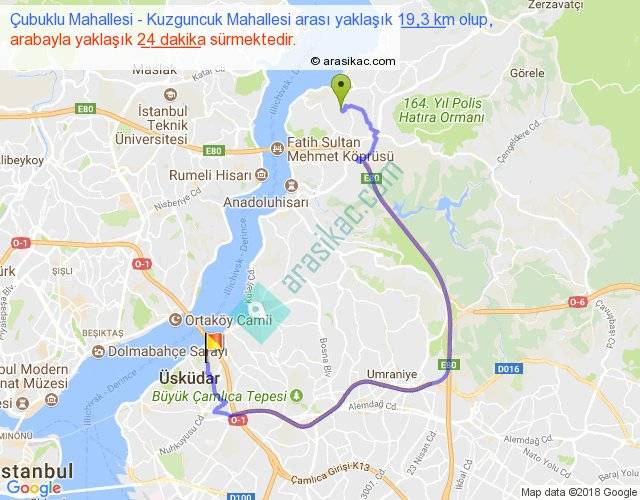 Çubuklu Mahallesi - Kuzguncuk Mahallesi arası yaklaşık olarak 90 km/h ile yukarıda belirtilen sürede olup, iki yerin kuş uçuşu uzaklığı (mesafesi) 8'dir. Yolculuk otobüsle 31 dakika sürmektedir.