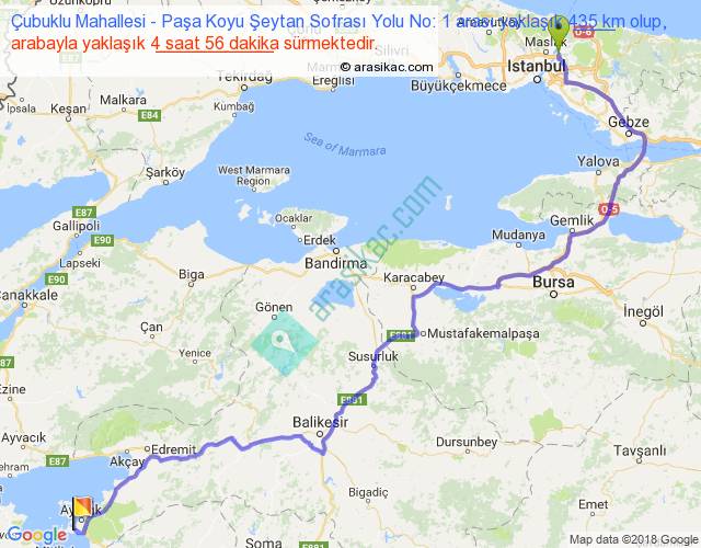 Çubuklu Mahallesi - Paşa Koyu Şeytan Sofrası Yolu No: 1 arası yaklaşık olarak 90 km/h ile yukarıda belirtilen sürede olup, iki yerin kuş uçuşu uzaklığı (mesafesi) 287'dir. Eğer belirtilen yerler arasında uçak seferi var ise bu süre uçakla 26 dakika'ya kadar düşebilir. Yolculuk otobüsle 6 saat 24 dakika sürmektedir.