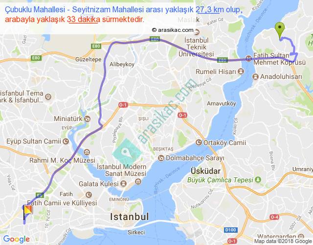 Çubuklu Mahallesi - Seyitnizam Mahallesi arası yaklaşık olarak 90 km/h ile yukarıda belirtilen sürede olup, iki yerin kuş uçuşu uzaklığı (mesafesi) 18'dir. Yolculuk otobüsle 42 dakika sürmektedir.