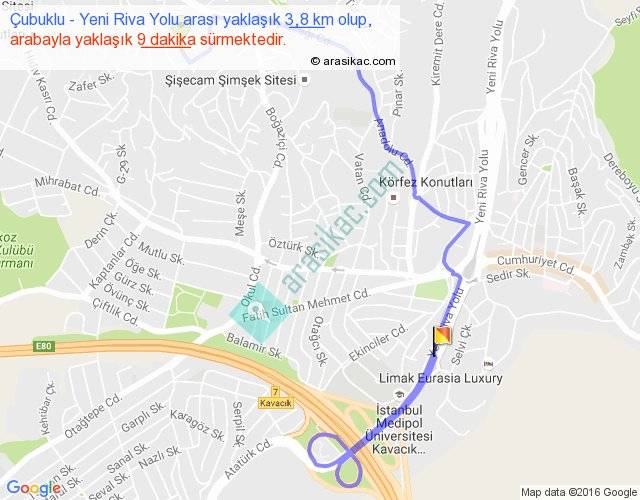 Çubuklu - Yeni Riva Yolu arası yaklaşık olarak 90 km/h ile yukarıda belirtilen sürede olup, iki yerin kuş uçuşu uzaklığı (mesafesi) 1'dir. Yolculuk otobüsle 11 dakika sürmektedir.