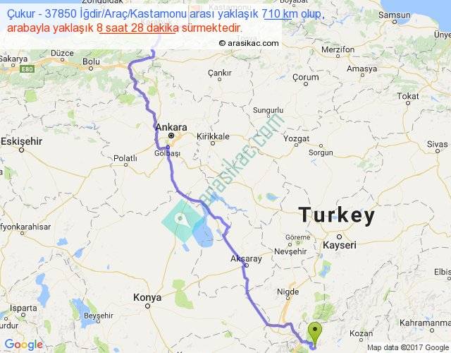 Çukur - 37850 İğdir Araç Kastamonu arası yaklaşık olarak 90 km/h ile yukarıda belirtilen sürede olup, iki yerin kuş uçuşu uzaklığı (mesafesi) 459'dir. Eğer belirtilen yerler arasında uçak seferi var ise bu süre uçakla 42 dakika'ya kadar düşebilir. Yolculuk otobüsle 11 saat 0 dakika sürmektedir.