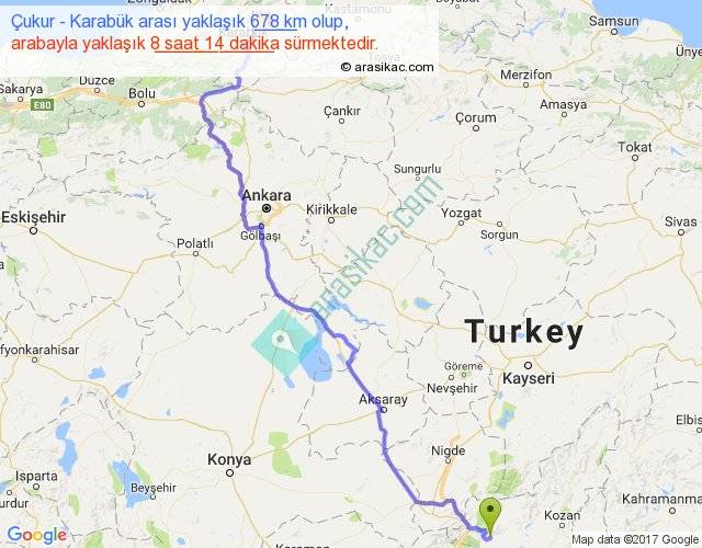 Çukur - Karabük arası yaklaşık olarak 90 km/h ile yukarıda belirtilen sürede olup, iki yerin kuş uçuşu uzaklığı (mesafesi) 469'dir. Eğer belirtilen yerler arasında uçak seferi var ise bu süre uçakla 43 dakika'ya kadar düşebilir. Yolculuk otobüsle 10 saat 42 dakika sürmektedir.