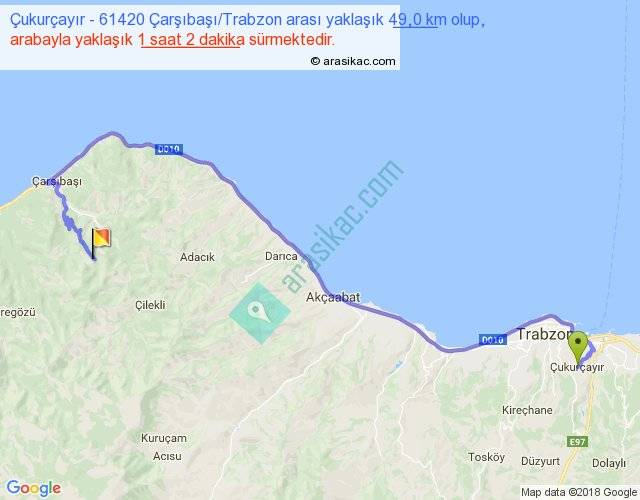 Çukurçayır - 61420 Çarşıbaşı Trabzon arası yaklaşık olarak 90 km/h ile yukarıda belirtilen sürede olup, iki yerin kuş uçuşu uzaklığı (mesafesi) 28'dir. Yolculuk otobüsle 1 saat 20 dakika sürmektedir.
