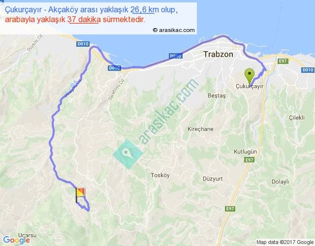 Çukurçayır - Akçaköy arası yaklaşık olarak 90 km/h ile yukarıda belirtilen sürede olup, iki yerin kuş uçuşu uzaklığı (mesafesi) 12'dir. Yolculuk otobüsle 48 dakika sürmektedir.