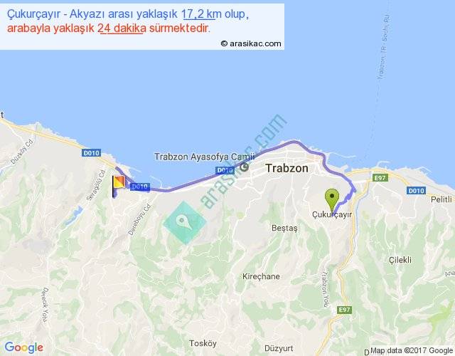 Çukurçayır - Akyazı arası yaklaşık olarak 90 km/h ile yukarıda belirtilen sürede olup, iki yerin kuş uçuşu uzaklığı (mesafesi) 9'dir. Yolculuk otobüsle 31 dakika sürmektedir.