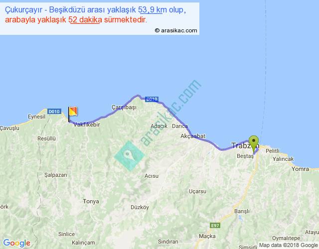 Çukurçayır - Beşikdüzü arası yaklaşık olarak 90 km/h ile yukarıda belirtilen sürede olup, iki yerin kuş uçuşu uzaklığı (mesafesi) 43'dir. Yolculuk otobüsle 1 saat 7 dakika sürmektedir.
