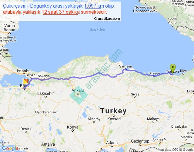 Çukurçayır - Doğanköy arası yaklaşık olarak 90 km/h ile yukarıda belirtilen sürede olup, iki yerin kuş uçuşu uzaklığı (mesafesi) 910'dir. Eğer belirtilen yerler arasında uçak seferi var ise bu süre uçakla 1 saat 24 dakika'ya kadar düşebilir. Yolculuk otobüsle 16 saat 24 dakika sürmektedir.