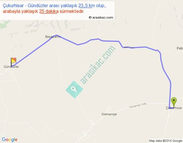 Çukurhisar - Gündüzler arası yaklaşık olarak 90 km/h ile yukarıda belirtilen sürede olup, iki yerin kuş uçuşu uzaklığı (mesafesi) 17'dir. Yolculuk otobüsle 32 dakika sürmektedir.
