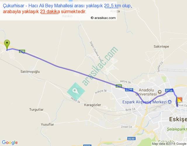 Çukurhisar - Hacı Ali Bey Mahallesi arası yaklaşık olarak 90 km/h ile yukarıda belirtilen sürede olup, iki yerin kuş uçuşu uzaklığı (mesafesi) 18'dir. Yolculuk otobüsle 29 dakika sürmektedir.