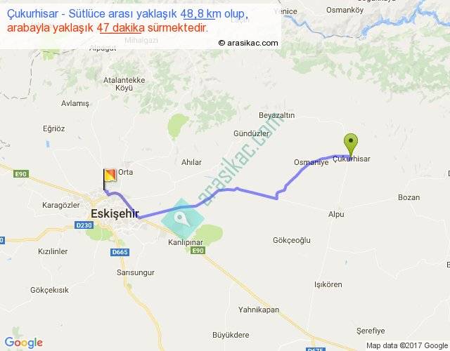 Çukurhisar - Sütlüce arası yaklaşık olarak 90 km/h ile yukarıda belirtilen sürede olup, iki yerin kuş uçuşu uzaklığı (mesafesi) 41'dir. Yolculuk otobüsle 1 saat 1 dakika sürmektedir.