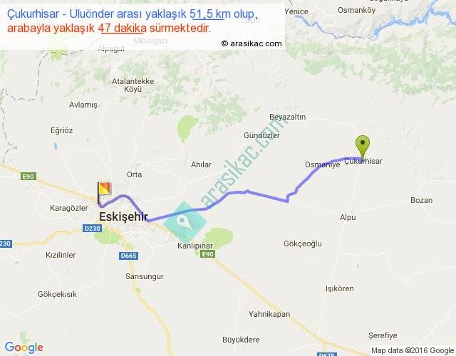Çukurhisar - Uluönder arası yaklaşık olarak 90 km/h ile yukarıda belirtilen sürede olup, iki yerin kuş uçuşu uzaklığı (mesafesi) 44'dir. Yolculuk otobüsle 1 saat 1 dakika sürmektedir.
