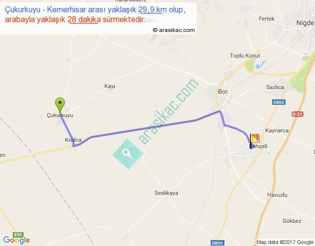 Çukurkuyu - Kemerhisar arası yaklaşık olarak 90 km/h ile yukarıda belirtilen sürede olup, iki yerin kuş uçuşu uzaklığı (mesafesi) 24'dir. Yolculuk otobüsle 36 dakika sürmektedir.