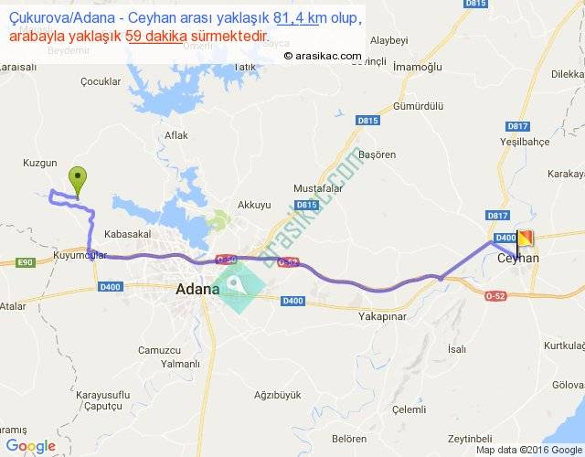 Çukurova Adana - Ceyhan arası yaklaşık olarak 90 km/h ile yukarıda belirtilen sürede olup, iki yerin kuş uçuşu uzaklığı (mesafesi) 59'dir. Yolculuk otobüsle 1 saat 16 dakika sürmektedir.