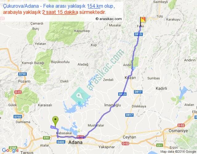 Çukurova Adana - Feke arası yaklaşık olarak 90 km/h ile yukarıda belirtilen sürede olup, iki yerin kuş uçuşu uzaklığı (mesafesi) 103'dir. Yolculuk otobüsle 2 saat 55 dakika sürmektedir.