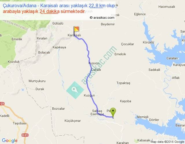 Çukurova Adana - Karaisalı arası yaklaşık olarak 90 km/h ile yukarıda belirtilen sürede olup, iki yerin kuş uçuşu uzaklığı (mesafesi) 19'dir. Yolculuk otobüsle 31 dakika sürmektedir.