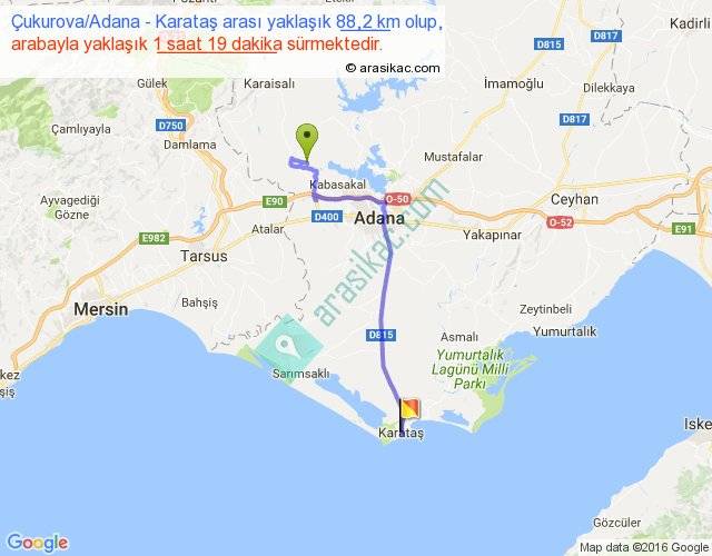 Çukurova Adana - Karataş arası yaklaşık olarak 90 km/h ile yukarıda belirtilen sürede olup, iki yerin kuş uçuşu uzaklığı (mesafesi) 62'dir. Yolculuk otobüsle 1 saat 42 dakika sürmektedir.