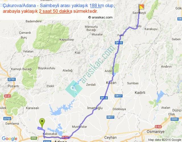 Çukurova Adana - Saimbeyli arası yaklaşık olarak 90 km/h ile yukarıda belirtilen sürede olup, iki yerin kuş uçuşu uzaklığı (mesafesi) 128'dir. Yolculuk otobüsle 3 saat 41 dakika sürmektedir.