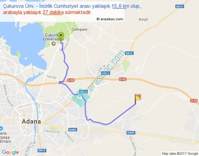 Çukurova Ünv. - İncirlik Cumhuriyet arası yaklaşık olarak 90 km/h ile yukarıda belirtilen sürede olup, iki yerin kuş uçuşu uzaklığı (mesafesi) 9'dir. Yolculuk otobüsle 35 dakika sürmektedir.