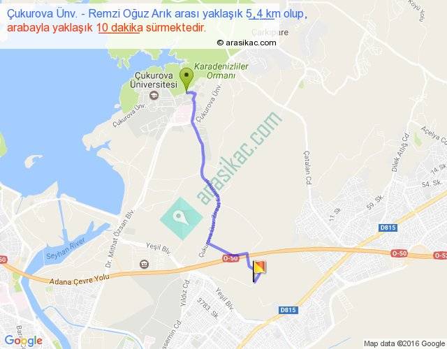 Çukurova Ünv. - Remzi Oğuz Arık arası yaklaşık olarak 90 km/h ile yukarıda belirtilen sürede olup, iki yerin kuş uçuşu uzaklığı (mesafesi) 4'dir. Yolculuk otobüsle 13 dakika sürmektedir.