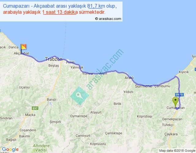 Cumapazarı - Akçaabat arası yaklaşık olarak 90 km/h ile yukarıda belirtilen sürede olup, iki yerin kuş uçuşu uzaklığı (mesafesi) 61'dir. Yolculuk otobüsle 1 saat 34 dakika sürmektedir.