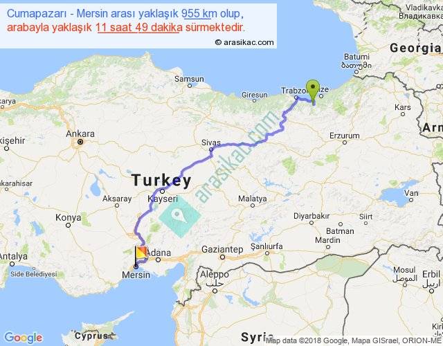 Cumapazarı - Mersin arası yaklaşık olarak 90 km/h ile yukarıda belirtilen sürede olup, iki yerin kuş uçuşu uzaklığı (mesafesi) 657'dir. Eğer belirtilen yerler arasında uçak seferi var ise bu süre uçakla 1 saat 00 dakika'ya kadar düşebilir. Yolculuk otobüsle 15 saat 21 dakika sürmektedir.
