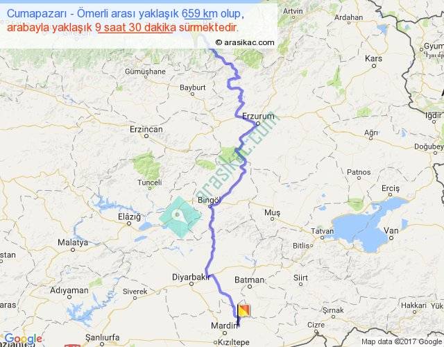 Cumapazarı - Ömerli arası yaklaşık olarak 90 km/h ile yukarıda belirtilen sürede olup, iki yerin kuş uçuşu uzaklığı (mesafesi) 384'dir. Eğer belirtilen yerler arasında uçak seferi var ise bu süre uçakla 35 dakika'ya kadar düşebilir. Yolculuk otobüsle 12 saat 21 dakika sürmektedir.