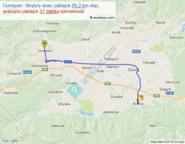 Cumayeri - Beyköy arası yaklaşık olarak 90 km/h ile yukarıda belirtilen sürede olup, iki yerin kuş uçuşu uzaklığı (mesafesi) 21'dir. Yolculuk otobüsle 48 dakika sürmektedir.