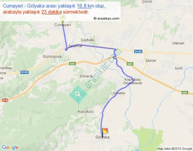 Cumayeri - Gölyaka arası yaklaşık olarak 90 km/h ile yukarıda belirtilen sürede olup, iki yerin kuş uçuşu uzaklığı (mesafesi) 11'dir. Yolculuk otobüsle 29 dakika sürmektedir.