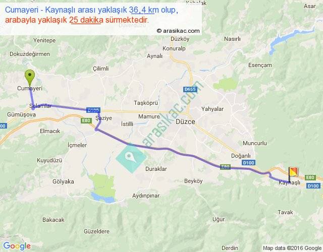 Cumayeri - Kaynaşlı arası yaklaşık olarak 90 km/h ile yukarıda belirtilen sürede olup, iki yerin kuş uçuşu uzaklığı (mesafesi) 31'dir. Yolculuk otobüsle 32 dakika sürmektedir.