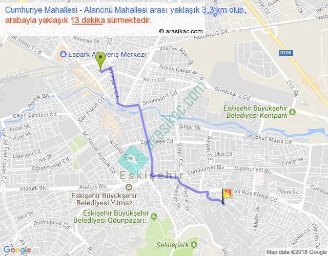 Cumhuriye Mahallesi - Alanönü Mahallesi arası yaklaşık olarak 90 km/h ile yukarıda belirtilen sürede olup, iki yerin kuş uçuşu uzaklığı (mesafesi) 3'dir. Yolculuk otobüsle 16 dakika sürmektedir.