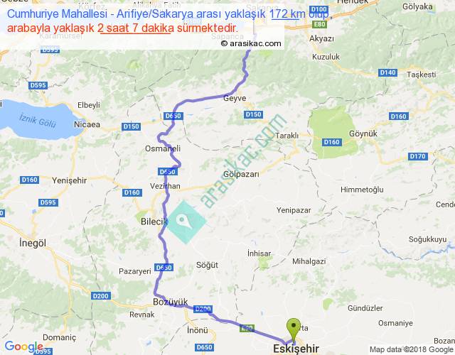 Cumhuriye Mahallesi - Arifiye Sakarya arası yaklaşık olarak 90 km/h ile yukarıda belirtilen sürede olup, iki yerin kuş uçuşu uzaklığı (mesafesi) 102'dir. Yolculuk otobüsle 2 saat 45 dakika sürmektedir.